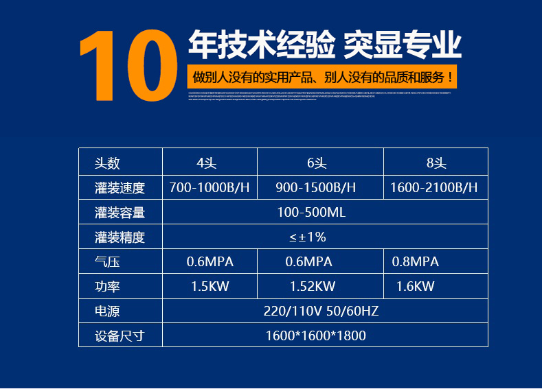 PPFM-4 | 700-1000b/h | 100-500ml | ≤±1% | 0.6MPa | 1.5KW | 220/110V 50/60Hz | 1600*1600*1800 |