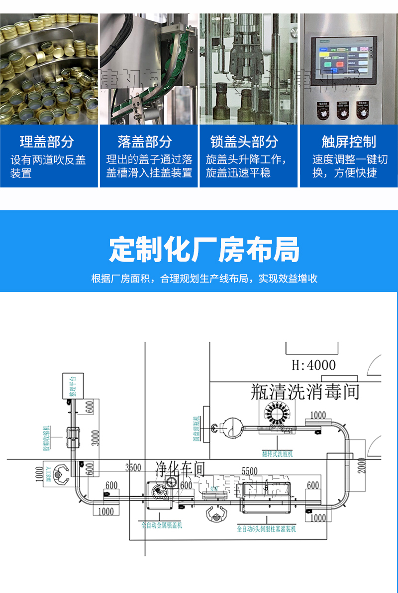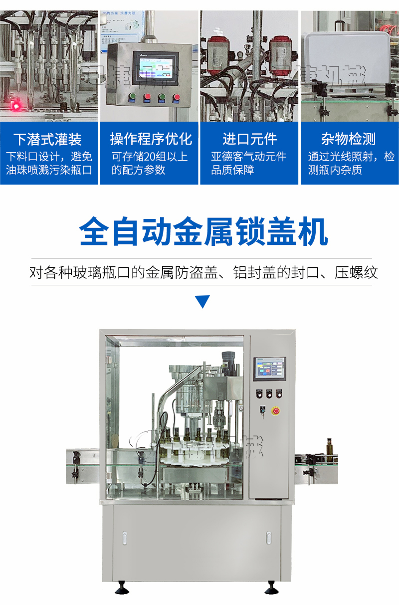本設備適用于醫(yī)藥、農藥、食品、化妝品、化工等行業(yè),主要針對各種玻璃瓶口的金屬防盜蓋、鋁封蓋的封口、壓螺紋等。該設備可單機使用,也可以與灌裝機等設備組成生產(chǎn)流水線自動作業(yè);