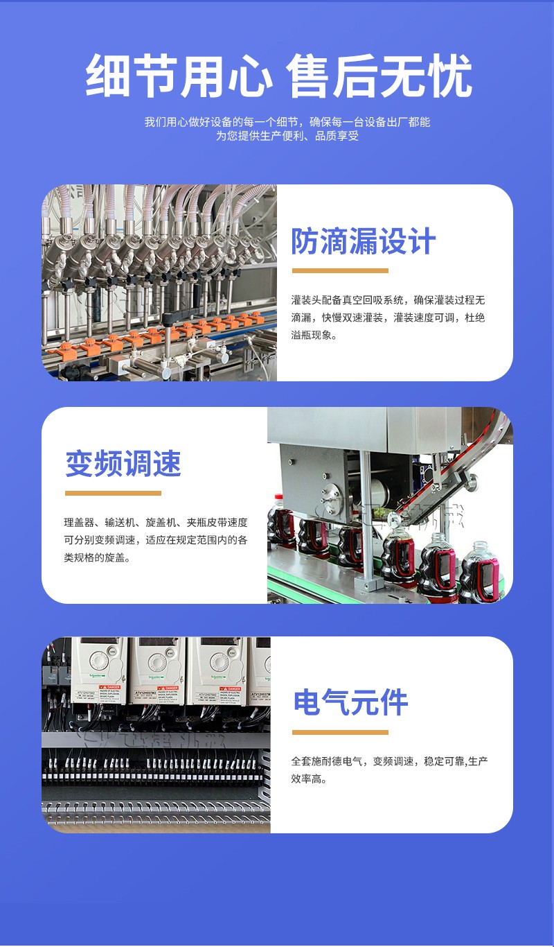 3、灌裝閥采用優(yōu)質(zhì)灌裝閥,下料速度快,灌裝量精準,且無滴漏現(xiàn)象產(chǎn)生。
