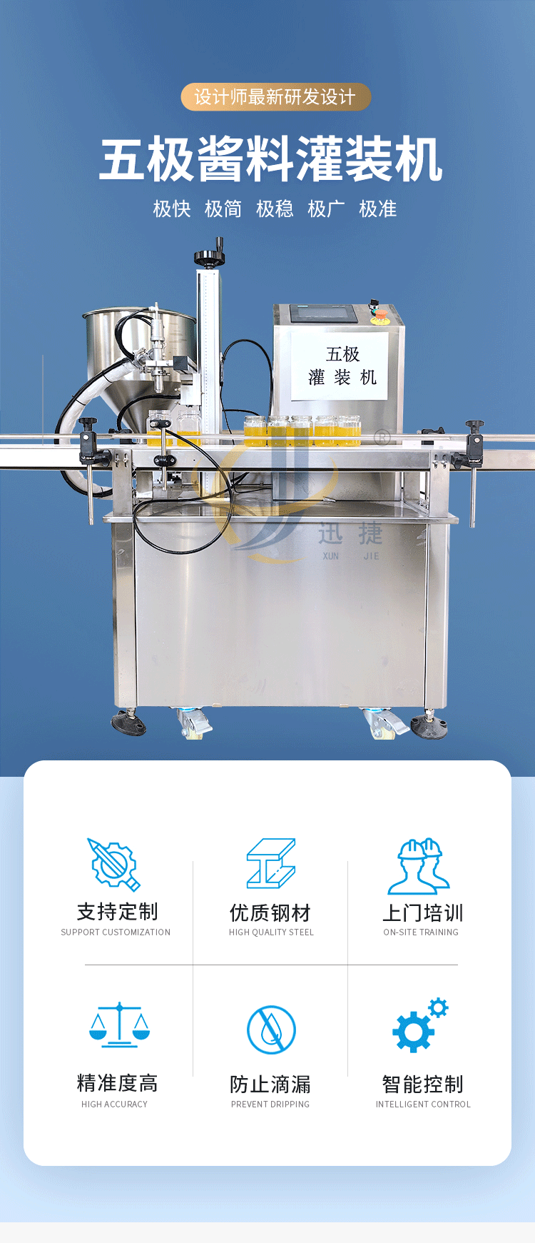 五極灌裝機:極快-單頭2200瓶/時 極簡-操作簡單 極廣-啥啥都能灌 極穩(wěn)-24小時不停機 極準-200g誤差小于1g。